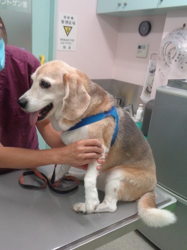 ビーグルのサンヨーちゃんの鍼灸治療の様子です。