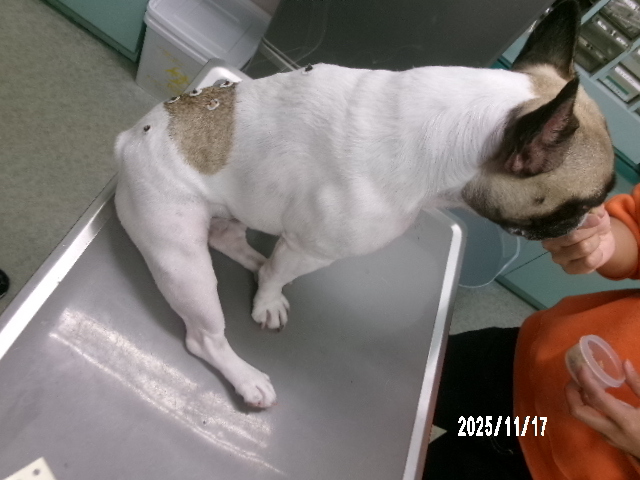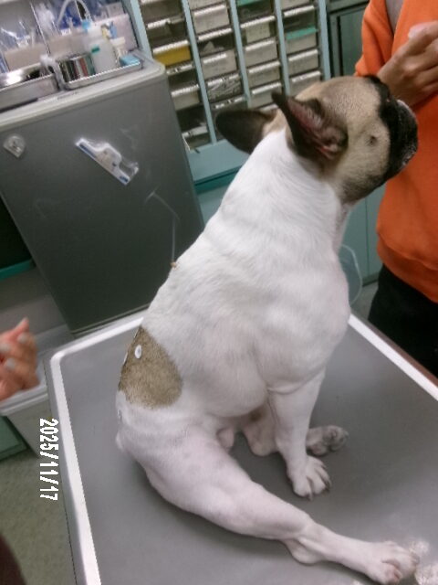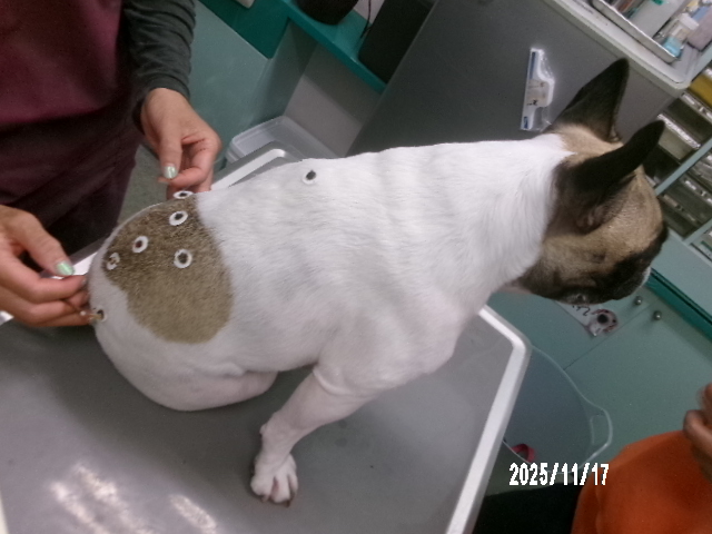 腰痛があるとのことで来院したフレンチブルドッグのスージーちゃんの鍼灸治療の様子です。